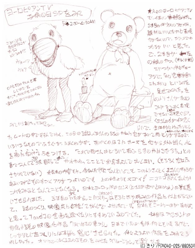 で、らくがきのネタがこどもの日特集という事で子供番組。らくがき見れば既に解る得体の知れない狂気ヽ(゚∀゚)ノ 見ただけで狂ってるというのが解るのだがこれは有名になってる「ももいろぞうさん」(やはり初出がフジ深夜枠でその後ウゴウゴルーガ枠でやってたはず)もよかったよね。あと少年モノの奴は(ぐぐっても出てこないしここが出ても嫌なのでらくがきの文章読んでね)結構お気に入りなんだけど録画データも残ってないというかビデオデッキは90年くらいから(しかももらい物の半分ジャンクみたいなやつ)だから。