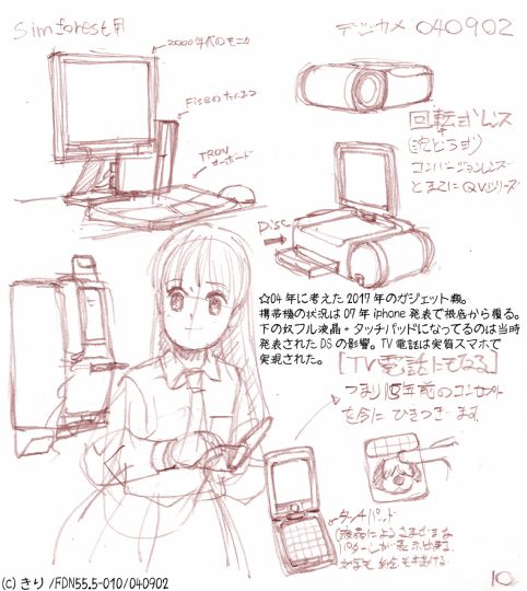 ☆ らくがき ☆ <FDN055.5・2004> 2004年に考えた2017年のデジタルガジェットヽ(゚∀゚)ノ 拙作SimForestの大元が1992年に考えた2017年のデジタルガジェット。さすがに04年以降にリメイクするにはもうちっとなんとかしないと、という事で考えた設定。この世界のキーボードはTRONキーボードが主流なんですよ〜ヽ(゚∀゚)ノ