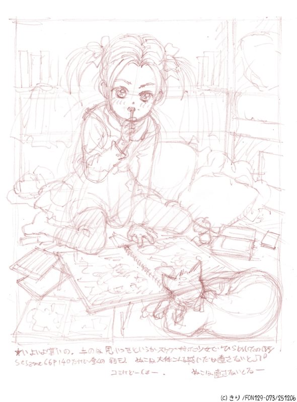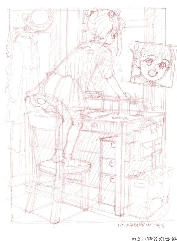 いやだって元とズレて正確じゃなくても誤魔化し効くしなぞると全体見えないから面倒なんだよねぇ・・・なんでみんなトレスが出来るのか_| ̄|○ まじな話、他人の画とかトレースした事って迷画座始めてからは無いハズなんだよヽ(゚∀゚)ノ 自分の原稿の下描きからはトレースじゃなくてクリンナップだからズレていても誤魔化せるしヽ(゚∀゚)ノ