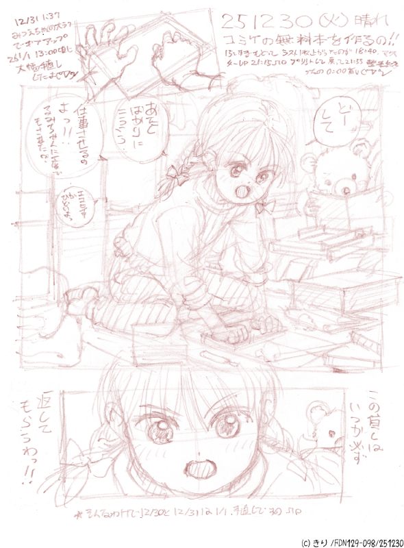 そろそろ129も終わるが130はまだ終わってないのでかつてぶろぐに掲載されたらくがきが入ってる奴も全部スキャン終わったので順次公開していこうという計画。ぶろぐで公開済のは再公開+αという予定。