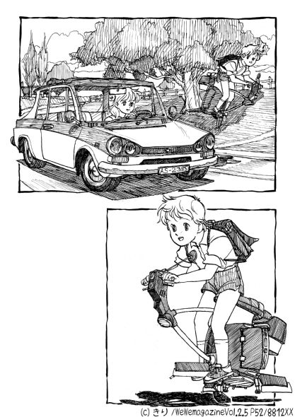 <WeWeMagazine2.5・1998> 上のをモディファイヽ(゚∀゚)ノ FDNは同人誌のネタ帳にもなってるので上のらくがきを元ネタに仕上げていたりもするんですよ。車のデザインも上のものからアレンジ(モディファイ)してそれっぽく。男の子が乗る飛行メカもまぁこんなの飛ぶわけもないのだがヽ(゚∀゚)ノ