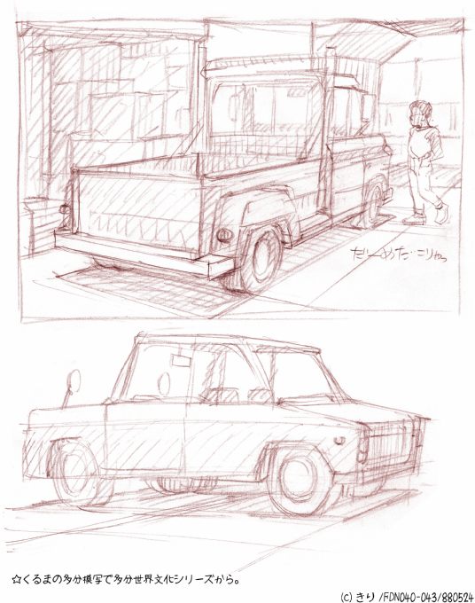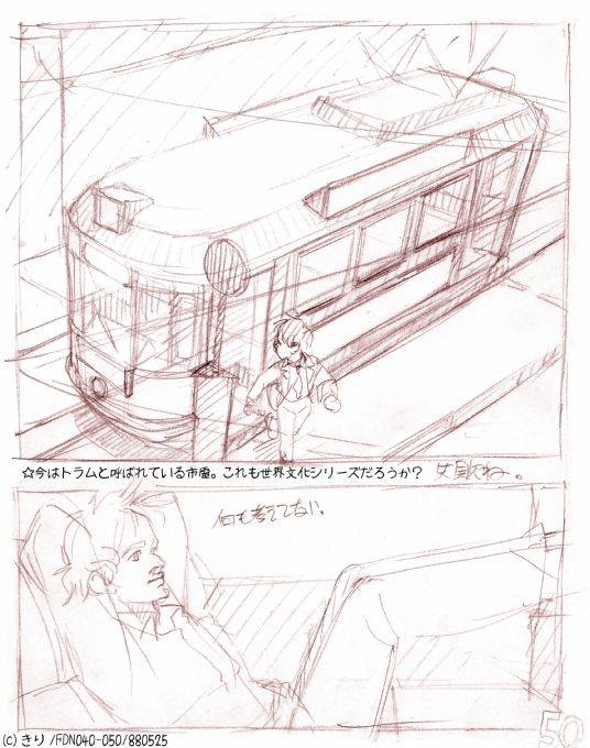 ☆ らくがき ☆ <FDN040・1988> トラムっていつから呼び始めたんだろう? いつの間にかメディアで使われてる呼称が変わってる件。上の奴は模写なのか参考にして別アングルにしたのか全く不明。でもパースの狂いかたがオリジナルぽいんだけどな。その下の穴埋めは多分オリジナル。