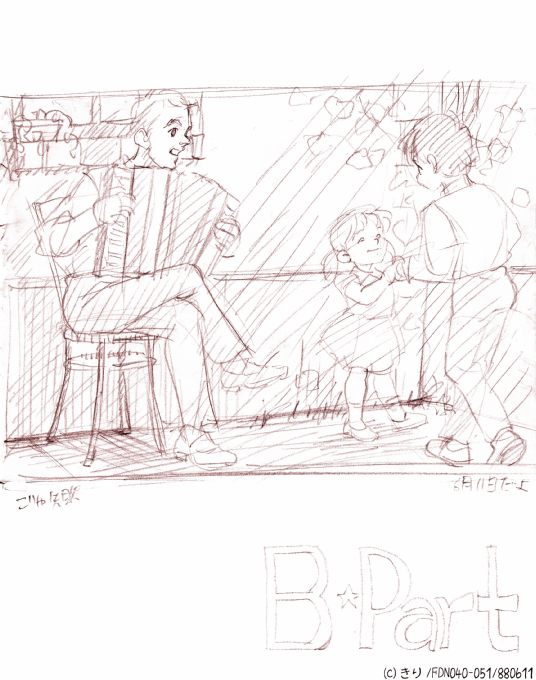 ☆ らくがき ☆ <FDN040・1988> (*^_^*) 失敗とか書いてるけど良い感じじゃないですか(*^_^*) 如何にも名作系というのはなんだけど、アコーディオン弾いてるおっさんはこの後漫画のネタに使われてたわけで、まだこの時はそこまで考えずに出したのだろう。
